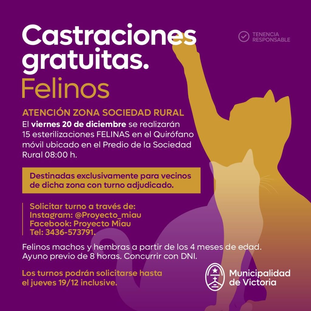 El 🗓️ viernes 20 de diciembre se realizarán 15 esterilizaciones 🐱 felinas en el Quirófano móvil, ubicado en el predio de la Sociedad Rural Victoria a las ⌚ 08:00 h, destinadas a vecinos de la zona.