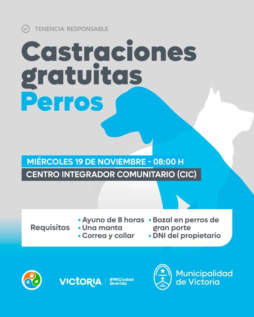 La Municipalidad de Victoria continúa desarrollando la campaña de esterilización canina sin arancel. El 🗓️ miércoles 19 de noviembre, en📍 el CIC (Cochabamba y Passo), a partir de las ⌚ 08:00 h se van a realizar 60 castración a perros machos y hembras. Los turnos se darán ese mismo día a partir de las 07:30 h por orden de llegada.