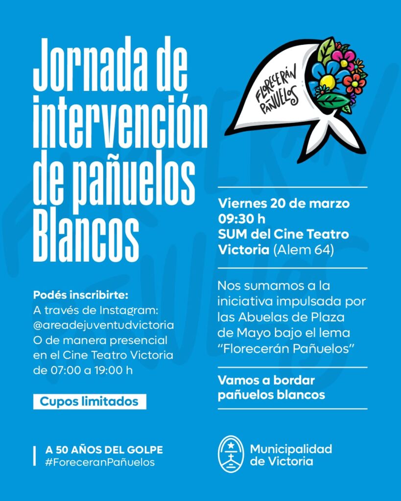 El Área de Juventud de la Municipalidad de Victoria se suma a la iniciativa impulsada por las Abuelas de Plaza de Mayo bajo el lema “Florecerán Pañuelos”, y te invita a participar de una jornada de intervención de pañuelos blancos.