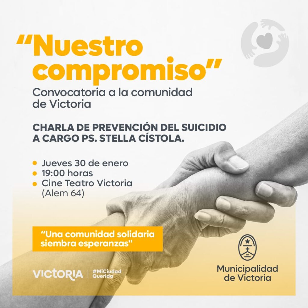Desde el Área de Salud Mental Comunitaria invitamos a la comunidad a la charla de concientización que brindará la Ps. Stella Cístola: «Prevención del suicidio: Nuestro Compromiso”. Se realizará el 🗓️ jueves 30 de enero a las ⌚ 19:00 h en el Cine Teatro Victoria (📍 Alem 64).