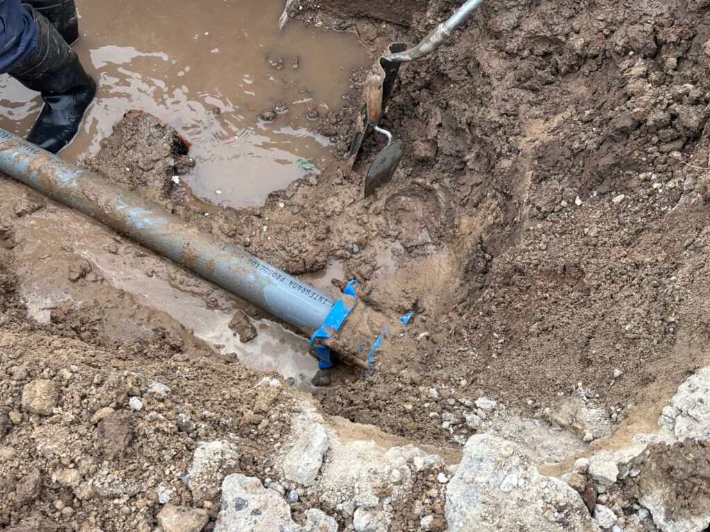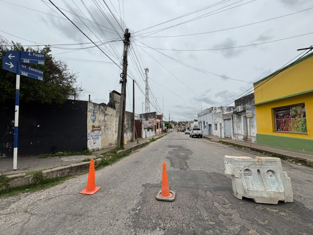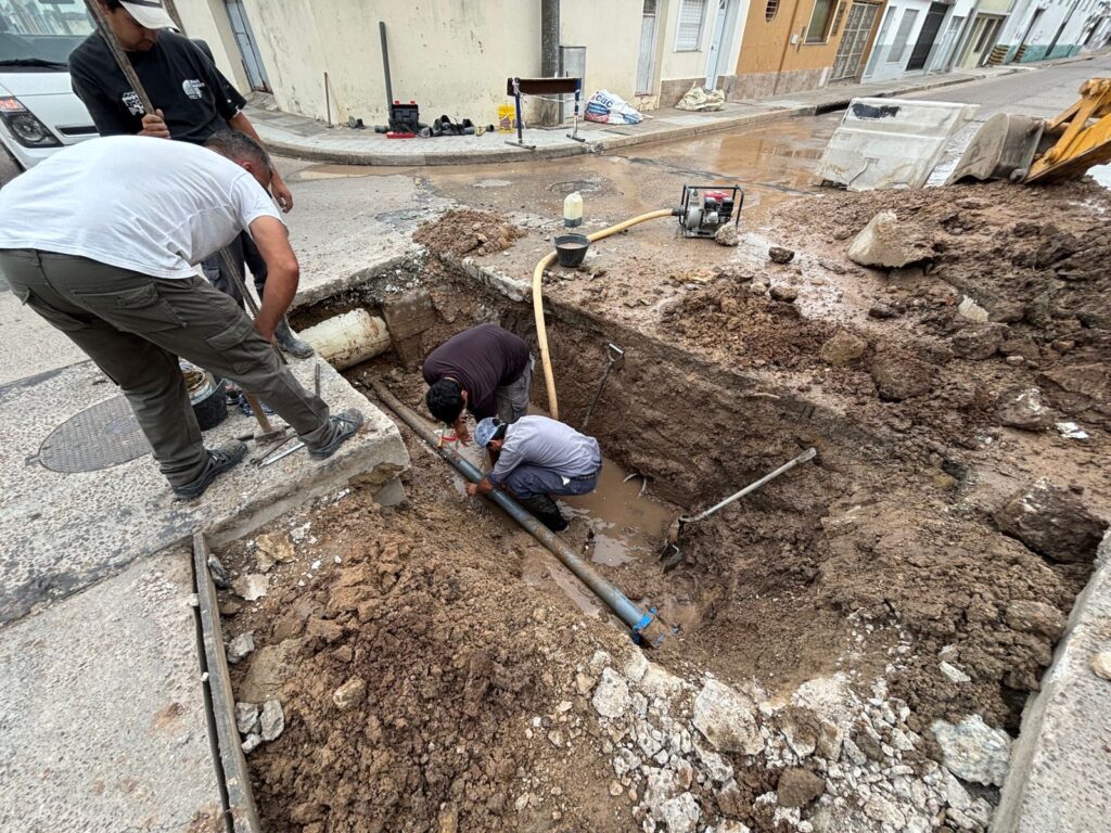 Personal de Obras Sanitarias se encuentra trabajando en la reparaci贸n de un ca帽o principal en la intersecci贸n de calles Per贸n y Camoirano, tras detectarse una rotura que provoc贸 baja presi贸n de agua en la zona.