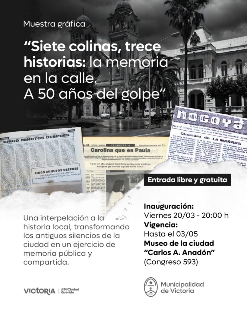A través de diversos ejes, la exposición analiza el impacto del terrorismo de Estado en nuestro territorio: desde la censura mediática y los operativos en la vía pública, hasta la reconstrucción biográfica de once ciudadanos desaparecidos y asesinados vinculados al departamento. Al restituir la identidad de las víctimas en su propio entorno geográfico, la muestra busca resignificar nuestras calles, convirtiéndolas en un escenario activo de memoria, verdad y justicia.